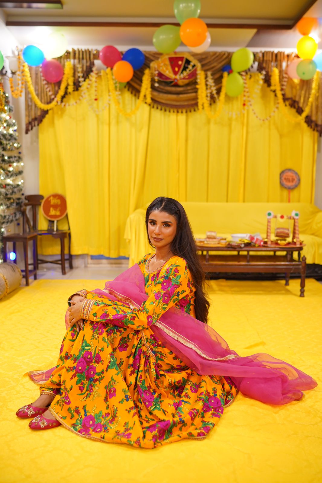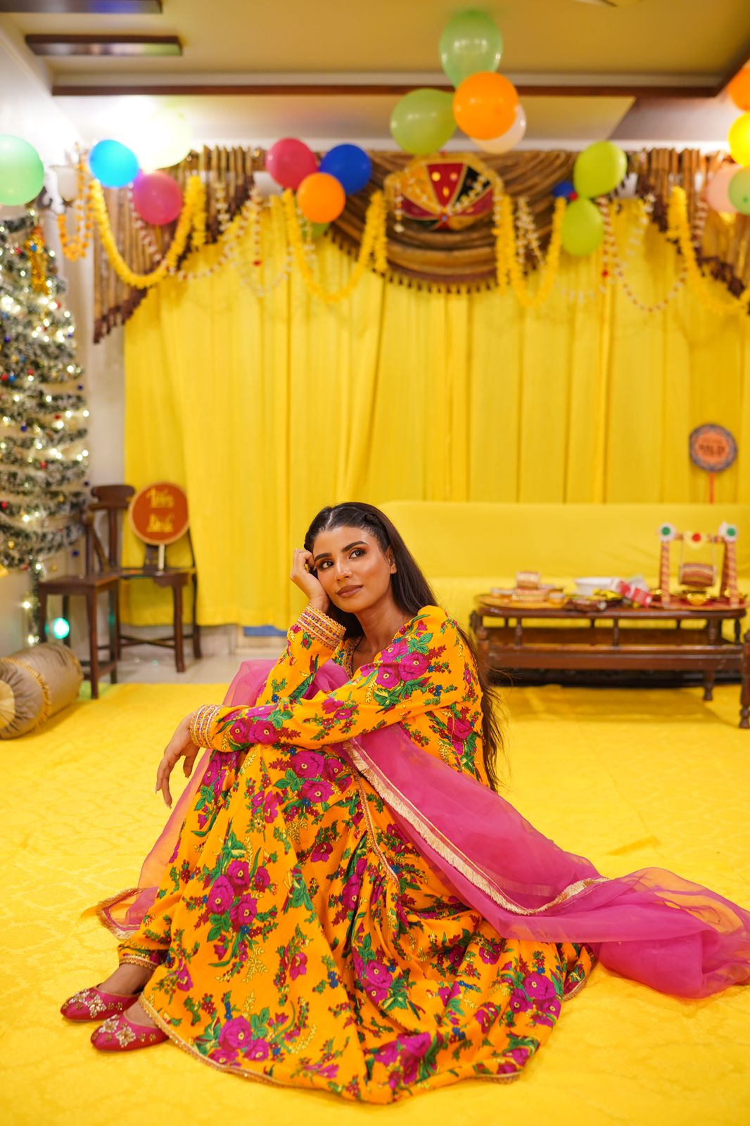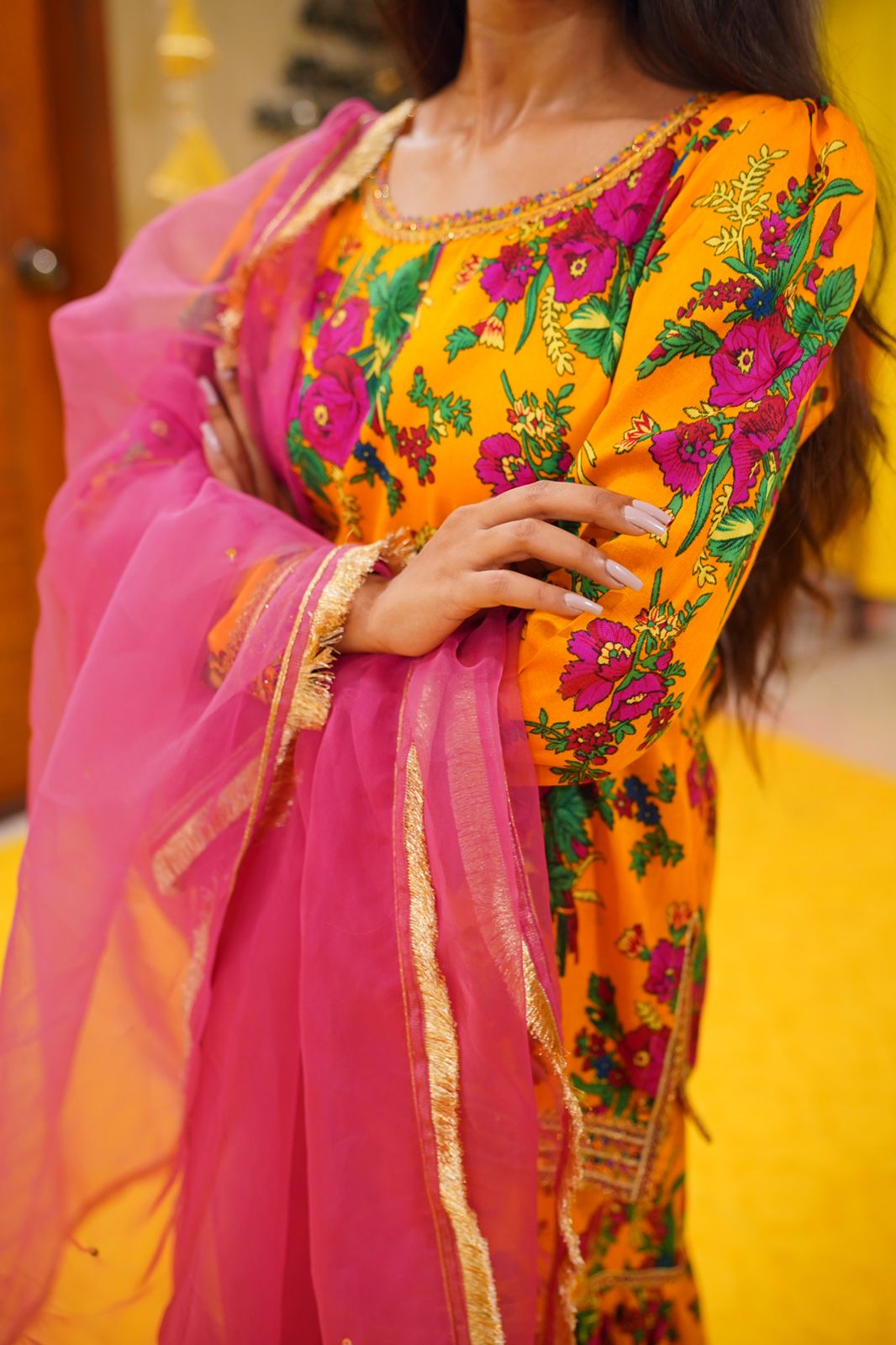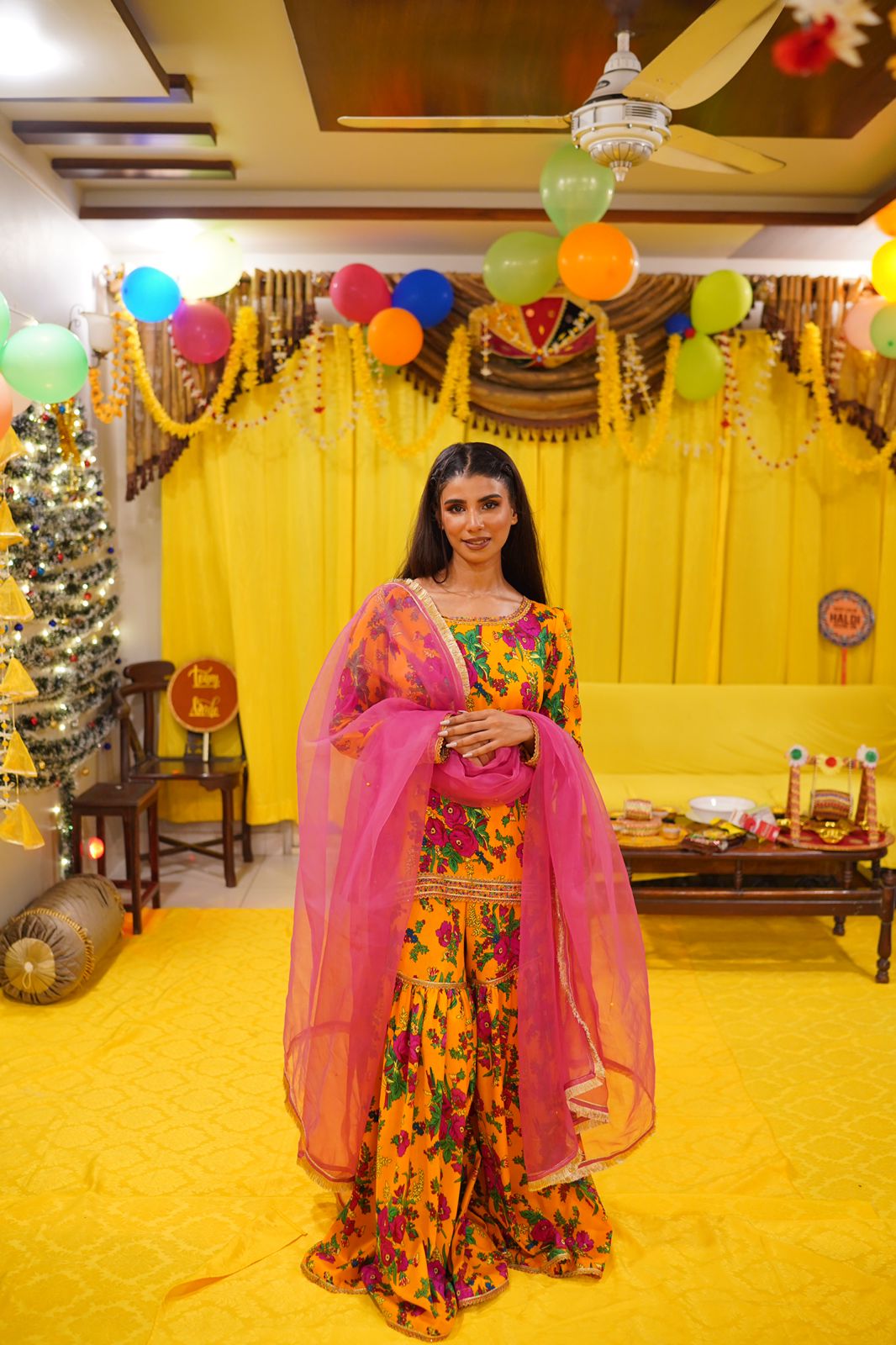 This Mustard Gharara set offers a perfect outfit for festive occasions. With its vibrant color and traditional design, it is sure to make a statement. Made with high-quality fabric, this set provides both style and comfort. Elevate your festive look with this Mustard Gharara set.