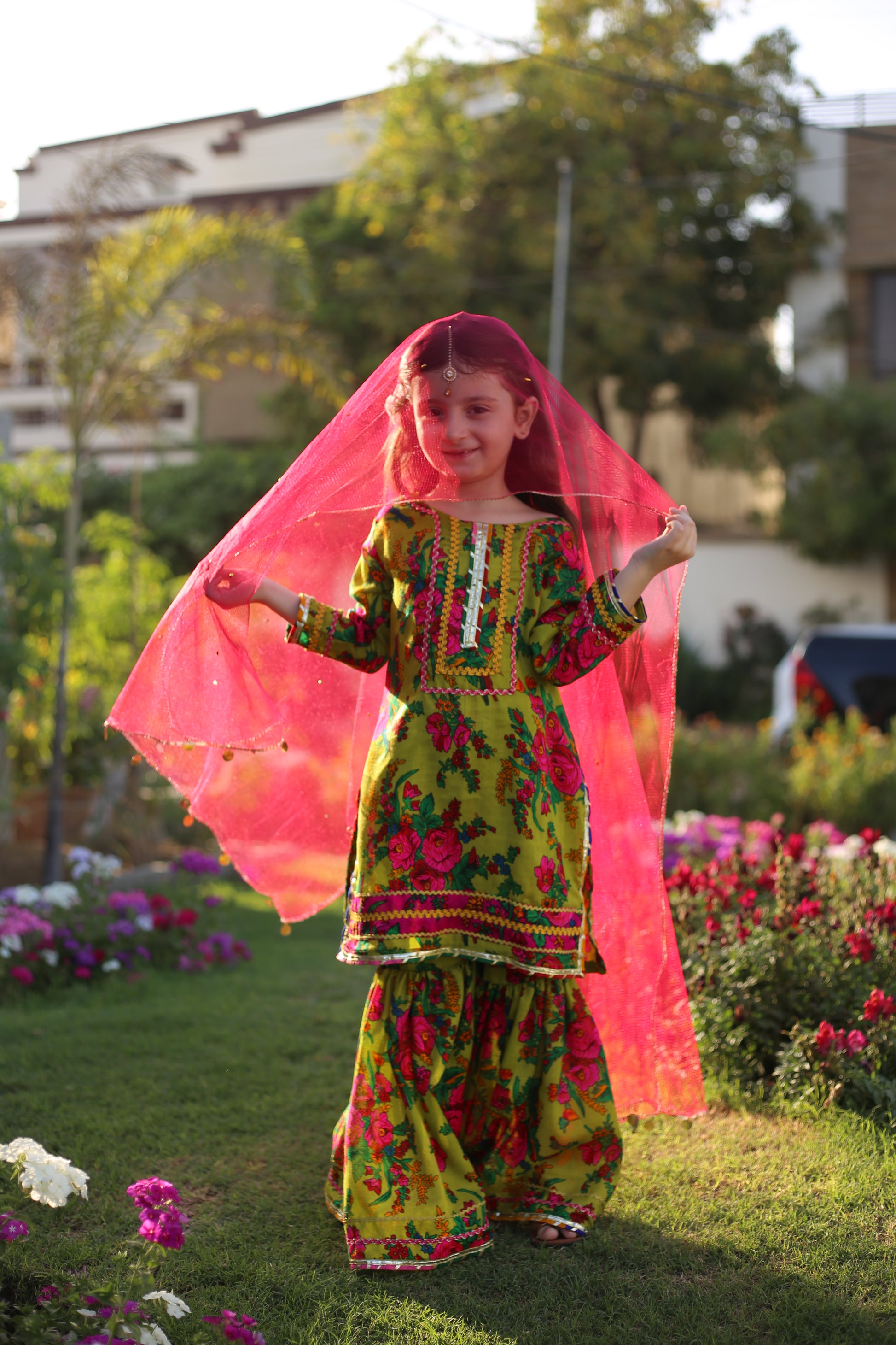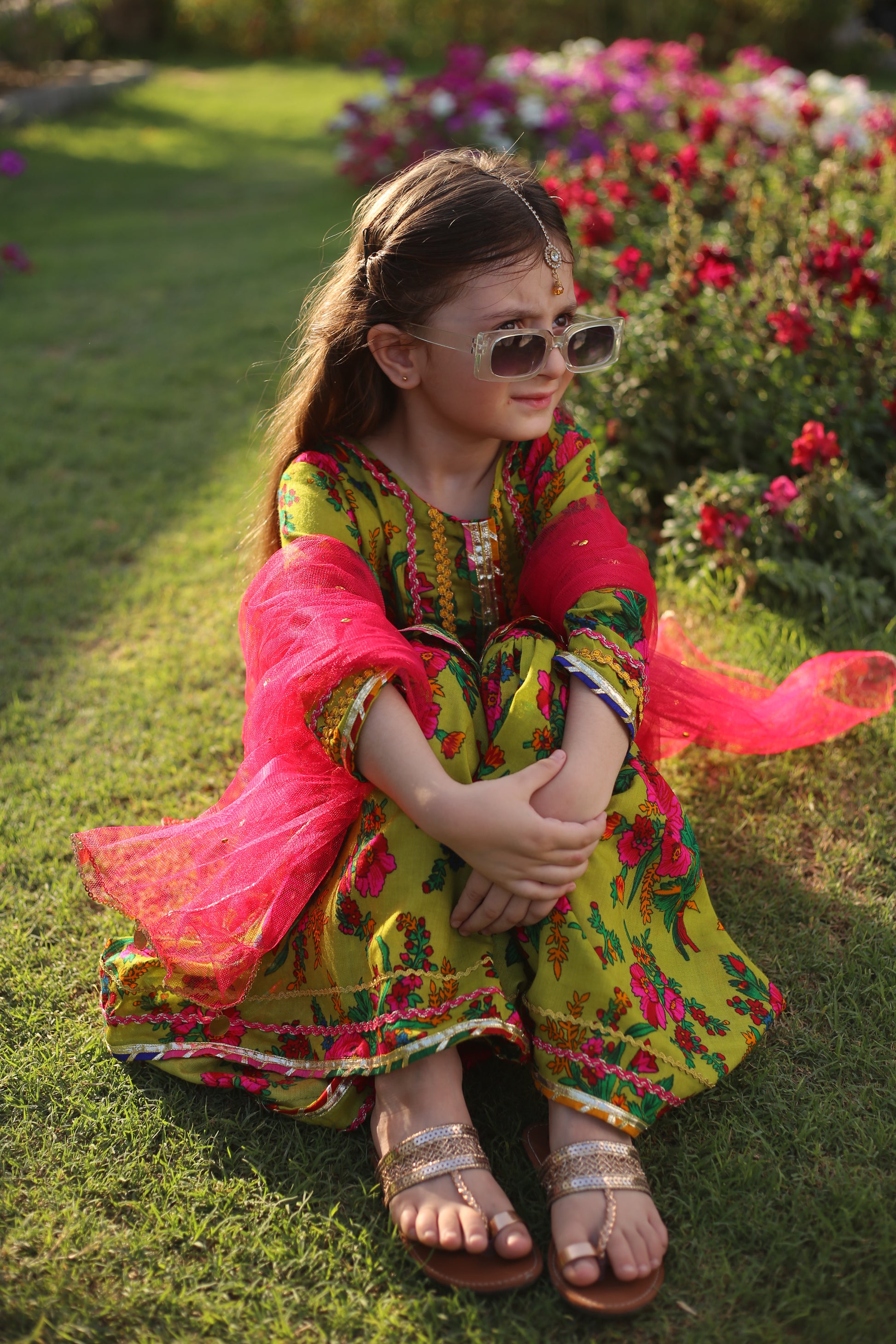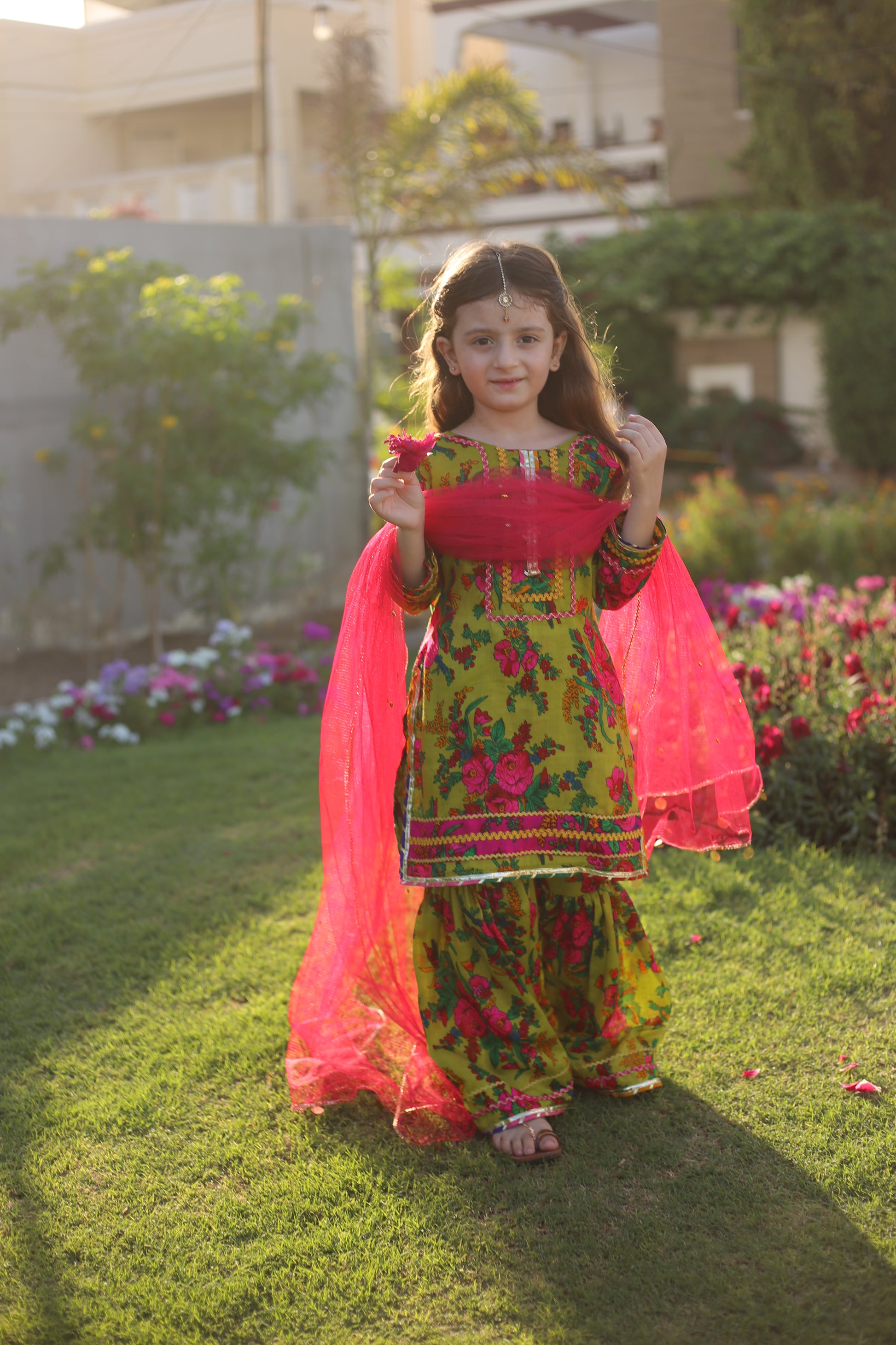 Indulge in luxury with Sabz Rang's Floral Print Embellished Gharara Set. Perfect for Eid and festive wear, this colorful three piece ensemble features a vibrant green floral print, adding a touch of exquisite elegance to any occasion. Let your child shine in style with Sabz Rang.