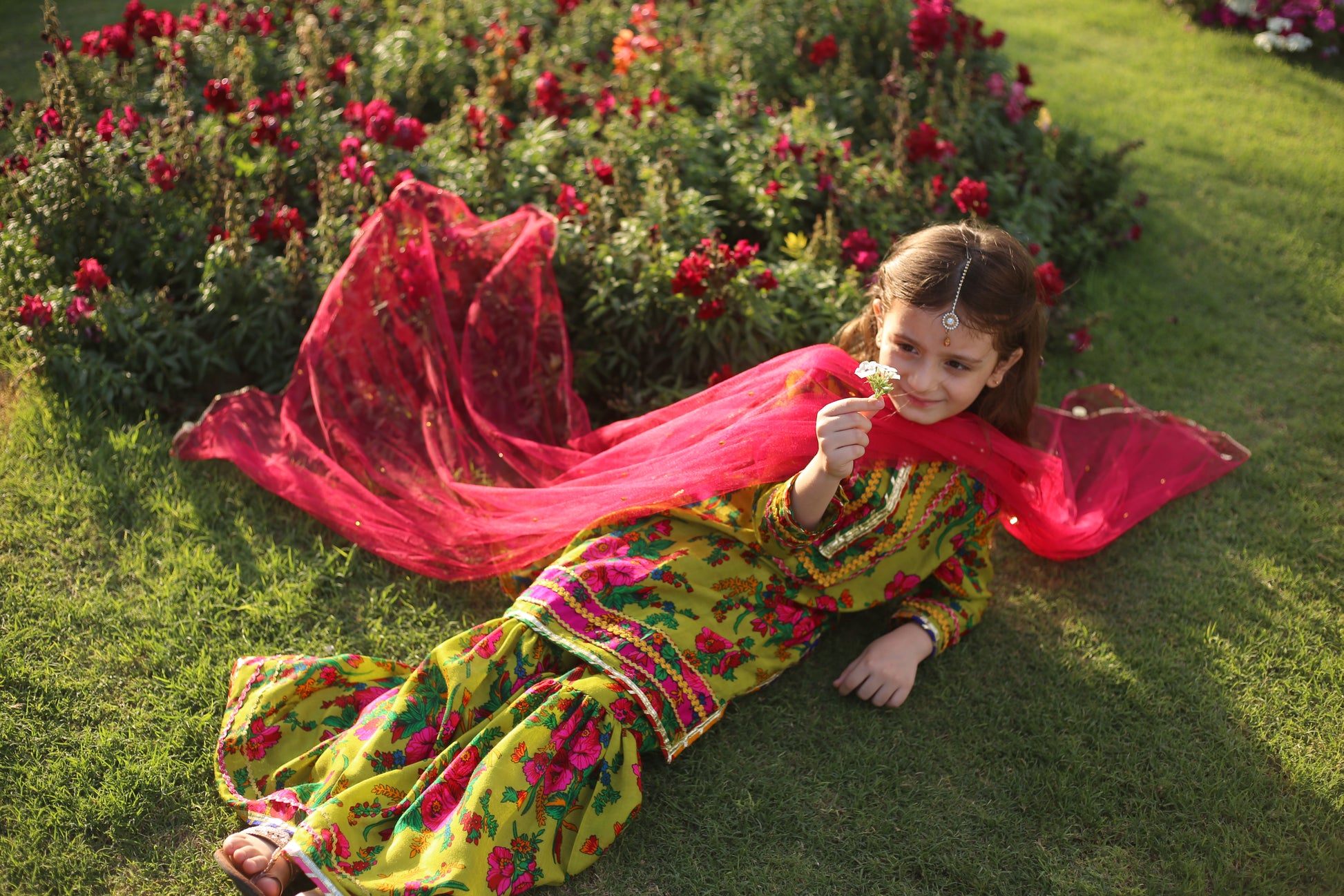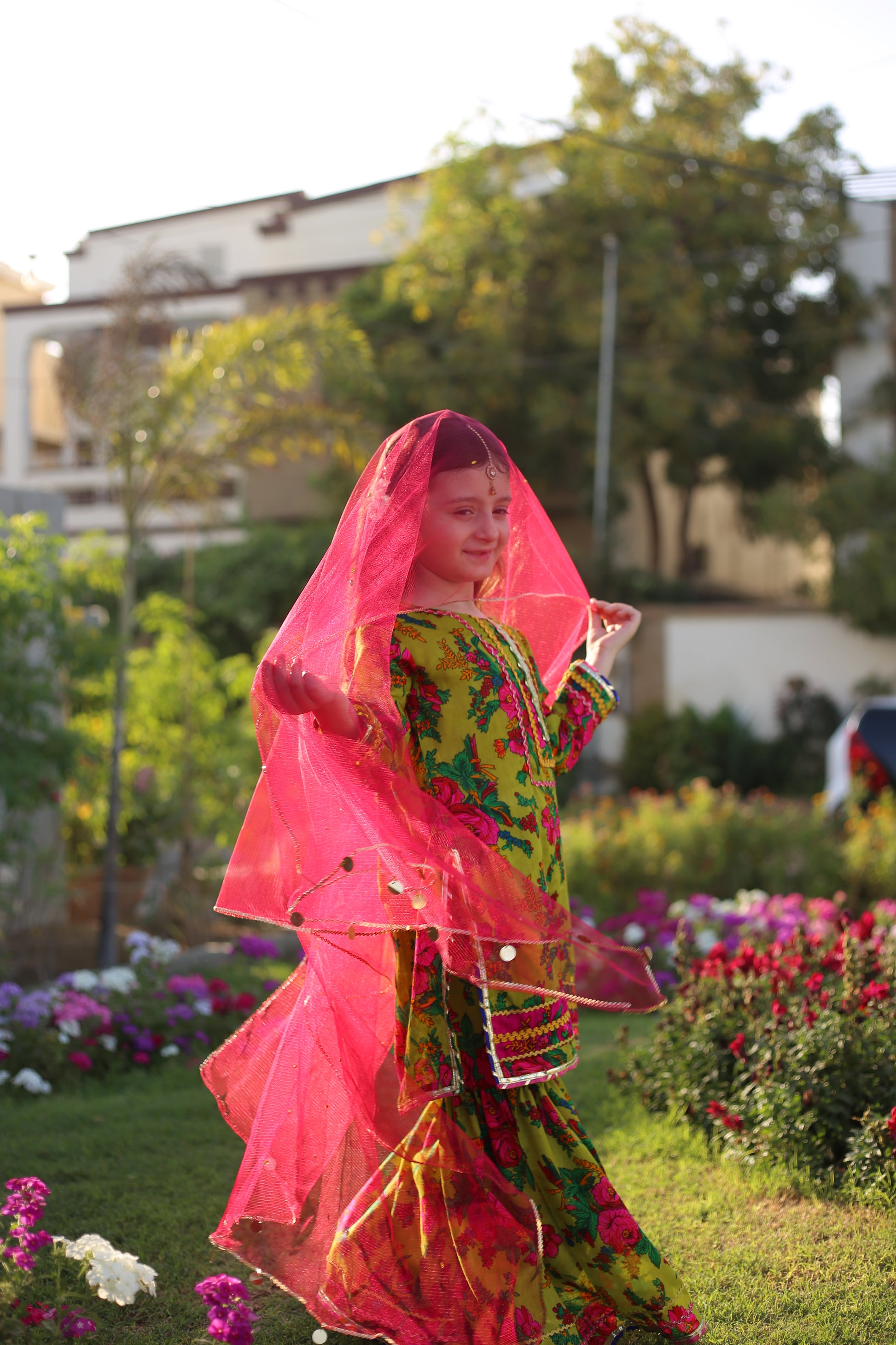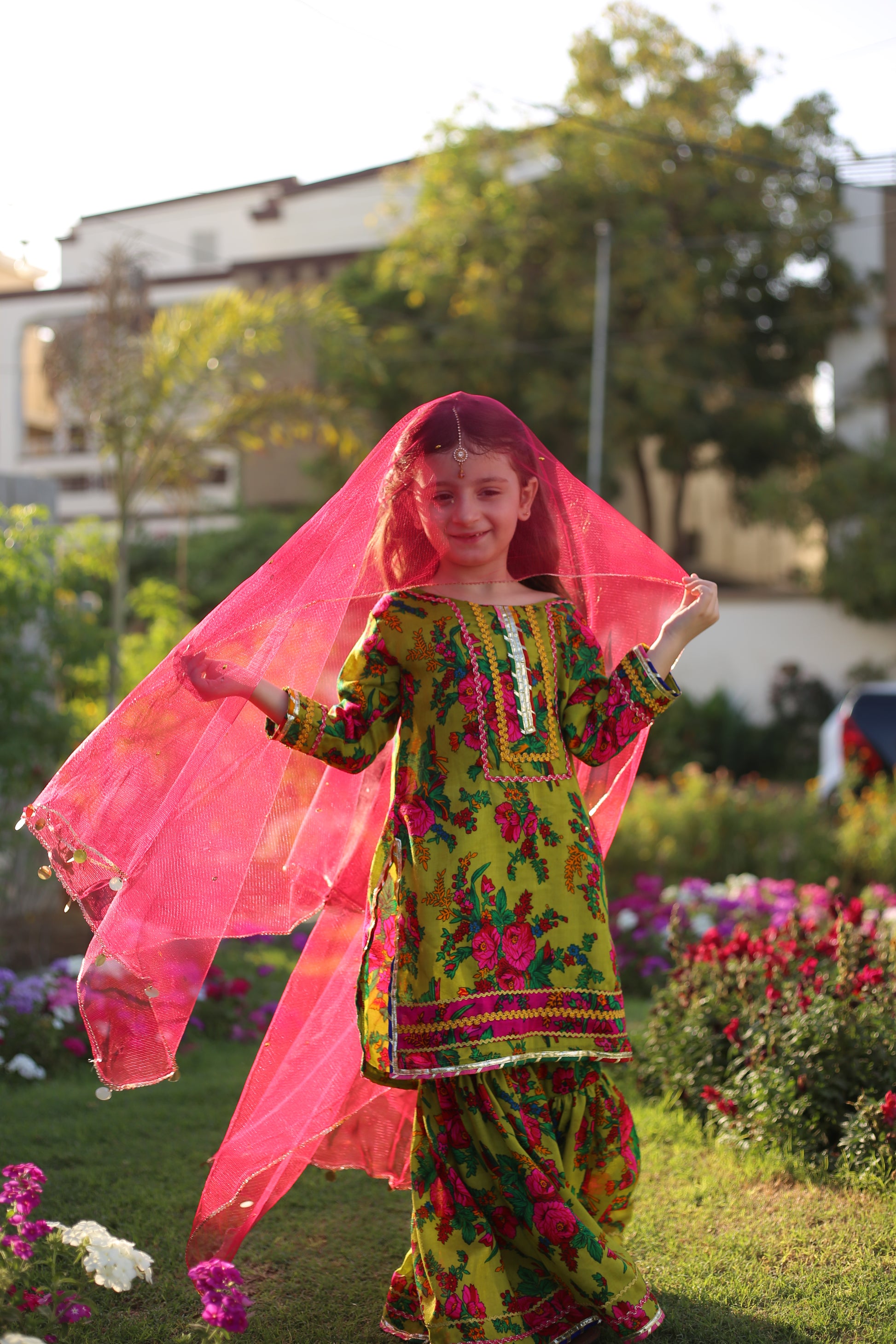Indulge in luxury with Sabz Rang's Floral Print Embellished Gharara Set. Perfect for Eid and festive wear, this colorful three piece ensemble features a vibrant green floral print, adding a touch of exquisite elegance to any occasion. Let your child shine in style with Sabz Rang.