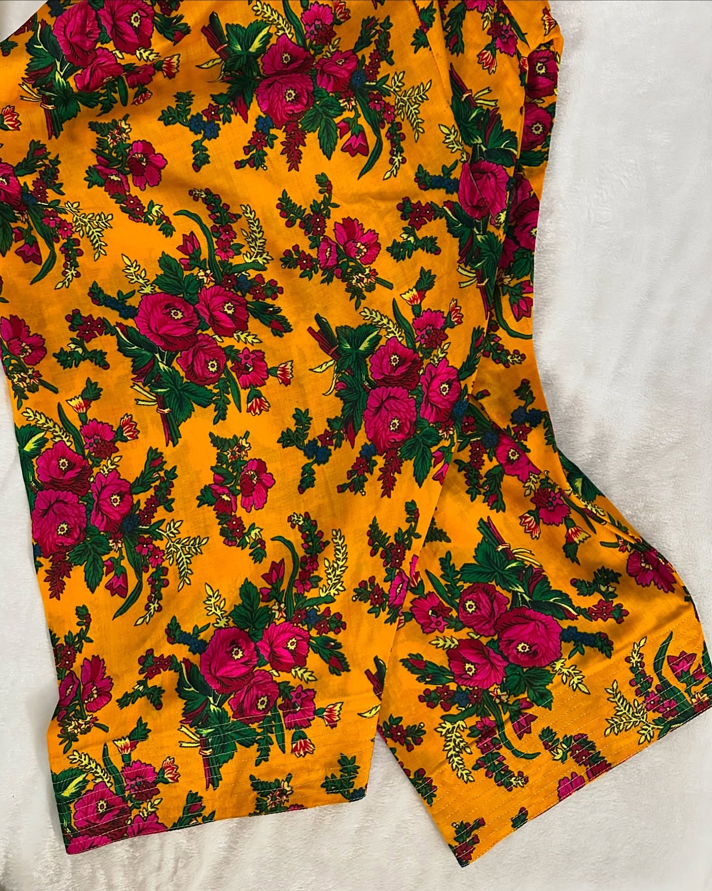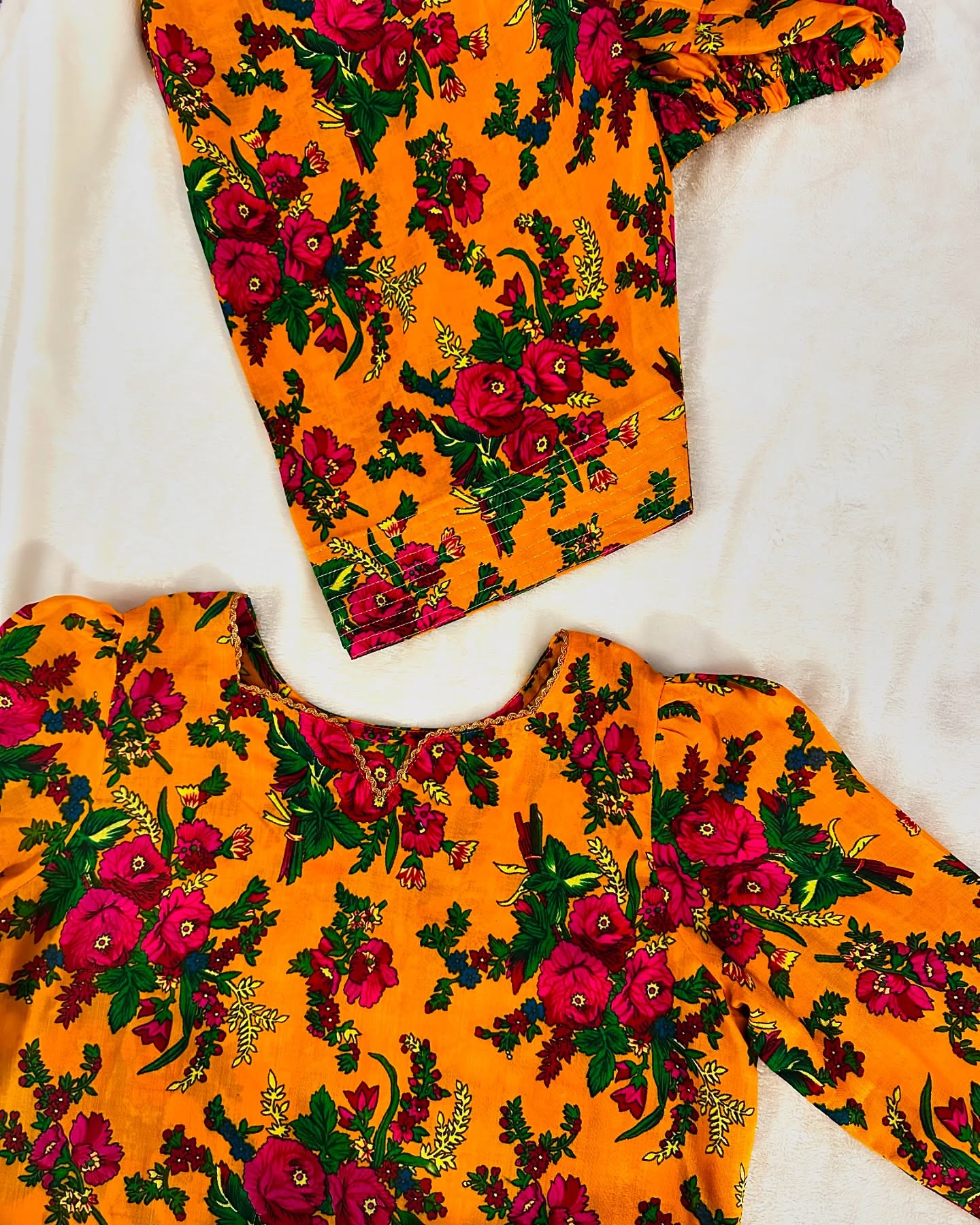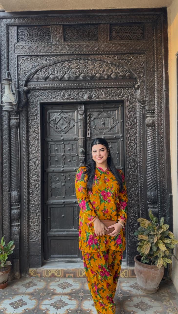 This Sarson ka Rang set features a matching set of chintz fabric and Farshi shalwar, perfect for those who appreciate traditional and elegant attire. Made with high-quality materials and expert craftsmanship, this set exudes timeless style and sophistication. Elevate your wardrobe with this must-have set.